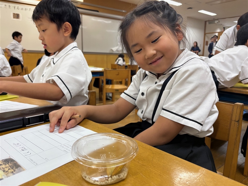 1年生の生活科では、生き物の観察に取り組みました。住む場所や体の特徴、動き方を観察し、関連について考えました。はじめは苦手そうな子も、観察しているうちに少しずつ慣れたようです。よく見ることでこれまで見えなかったこと、考えなかったことに気づくことができました。