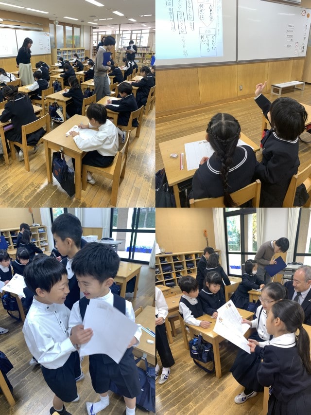 子どもたちが絵や写真を見て自分で文をつくり、その文の中にある「主語」と「述語」を見つける学習場面です。自分で書いた文の「主語」「述語」を見つけたり、友達が書いた文の「主語」「述語」を見つけたりする活動をしました。一人で考える時間、隣の席の友達や近くの友達と一緒に考える時間があり、子どもたち全員が真剣に考えながらも笑顔で学習を進めていました。指導されている先生は終始子どもたちが安心して学習できる工夫をされていました。子どもたちがつくった文の中には「主語」「述語」以外にも「修飾語」がありますが、子どもたちはしっかりと「主語」「述語」を見分けていました。しかし、文を一生懸命に長く書いた友達の文はどうしても長くなり、また、複雑になります。その中には見分けにくい「修飾語」も入っていて、子どもたちだけではどうしても見分けられない場面もありました。それでも、温かいご指導のおかげで、まちがって発言した児童は、安心して笑顔で自分の間違いに納得をしていました。最後まで温かい授業でした。