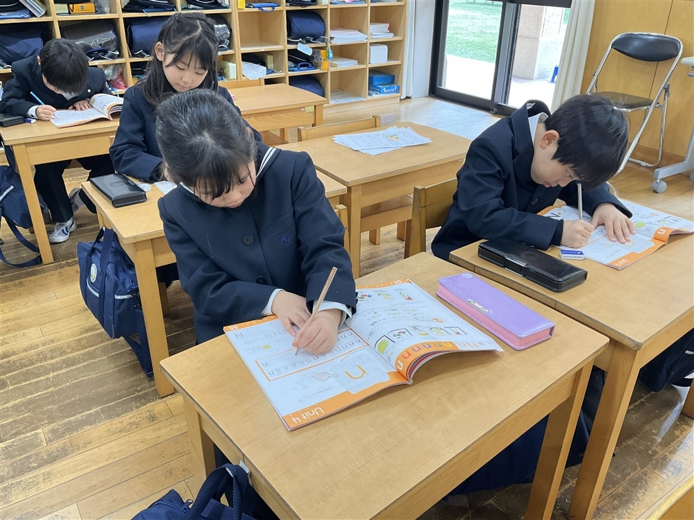 1年生は、英語の時間にアルファベットを習いました。今日習ったアルファベットは「N」です。ワークブックに書く際には、大文字が細くならないように書くことや、書き順に気を付けながら書くことを意識して書いていました。「小文字よりも大文字の方がバランス良く書くのが難しい…」「小文字は結構簡単に書けそう!」など、綺麗に書けるように取り組みました。もう少しで26文字すべてを習います。「次は何の文字かな?」と、次回も楽しみにしている姿が素敵でした。